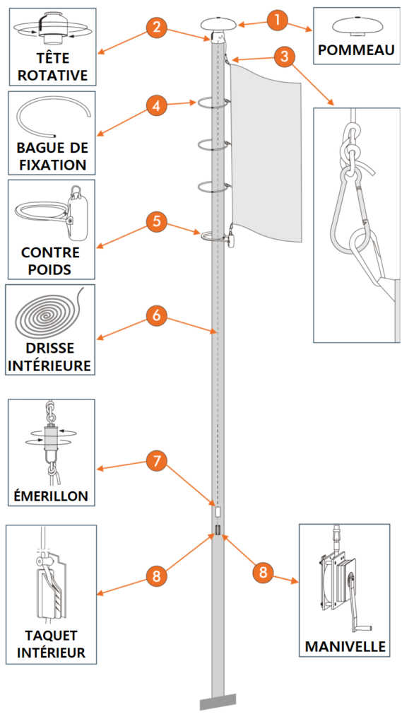 - Les mâts de drapeau peuvent avoir une hauteur de 6 à 12 mètres. Les mâts de drapeau doivent être installés et utilisés de manière à ne pas mettre en danger les personnes et les biens.
