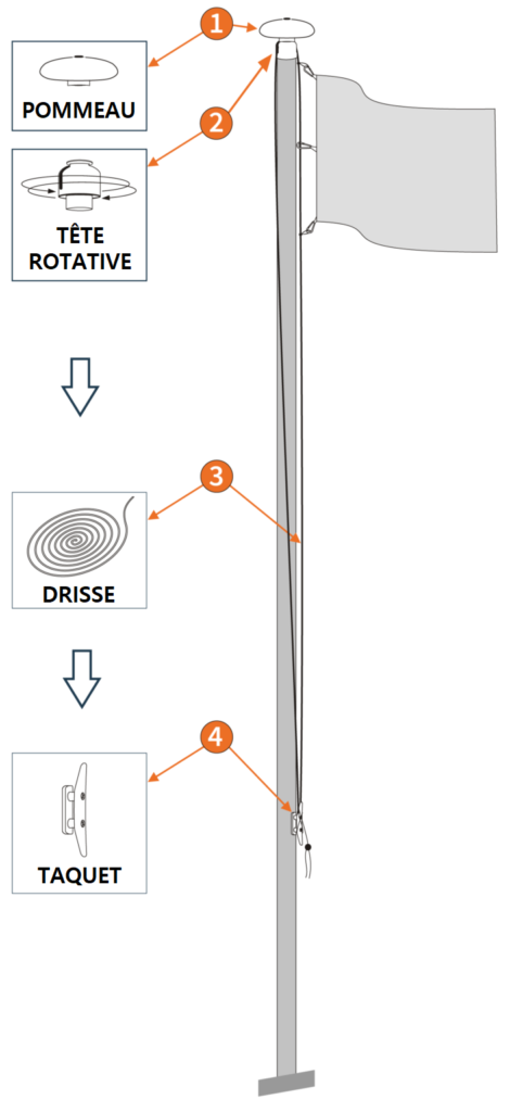 Le drapeau est érigé avec une corde située à l’extérieur du mât. Le câble est attaché au taquet avec un nœud à voile.